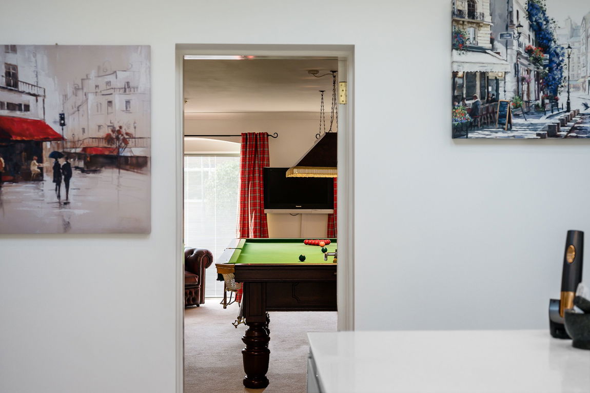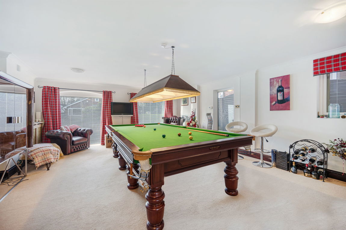 Completing the ground floor is a superb games room located just off the kitchen, a space that brings a real sense of fun and flexibility to the home. Currently set up with a full-size snooker table, the room also features a dedicated bar area, making it ideal for relaxed evenings, weekend gatherings or entertaining friends in a more informal setting. Dual-aspect windows allow plenty of natural light to flood in, ensuring the room feels bright and welcoming throughout the day, while still offering a comfortable atmosphere as the evening draws in. A beautifully tiled cloakroom/WC is located at the bottom of the hallway, finished with the same attention to detail seen throughout this impressive home.