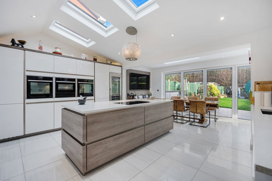 At the heart of the home lies the true showstopper of the ground floor living space. The kitchen is where this home really comes into its own. Designed as a generous open-plan space, it flows effortlessly into the dining area and the family room beyond, creating a layout that feels natural and sociable. Rooflights draw daylight deep into the room, while the large central island becomes the place everyone gravitates towards — whether that’s breakfast before school, a glass of wine in the evening, or friends gathering while dinner is prepared. Integrated Neff appliances sit neatly within the cabinetry, keeping the look clean and understated, and bi-folding doors open the space straight out onto the rear garden, making it just as enjoyable for both everyday living and memorable gatherings. Adjacent to the kitchen, the dining area offers a lovely space for special meals and more formal occasions. It’s a place where family gatherings and dinner parties come to life, with a sense of elegance that’s effortlessly comfortable. Beyond the dining area, the family area opens beneath a vaulted ceiling, creating a wonderful sense of space and light. It’s a room designed for quieter moments — somewhere to settle with a cuppa and a good book or simply unwind as the day draws to a close watching the sunset across the glorious garden.