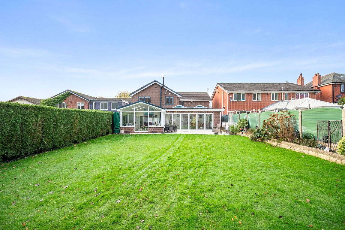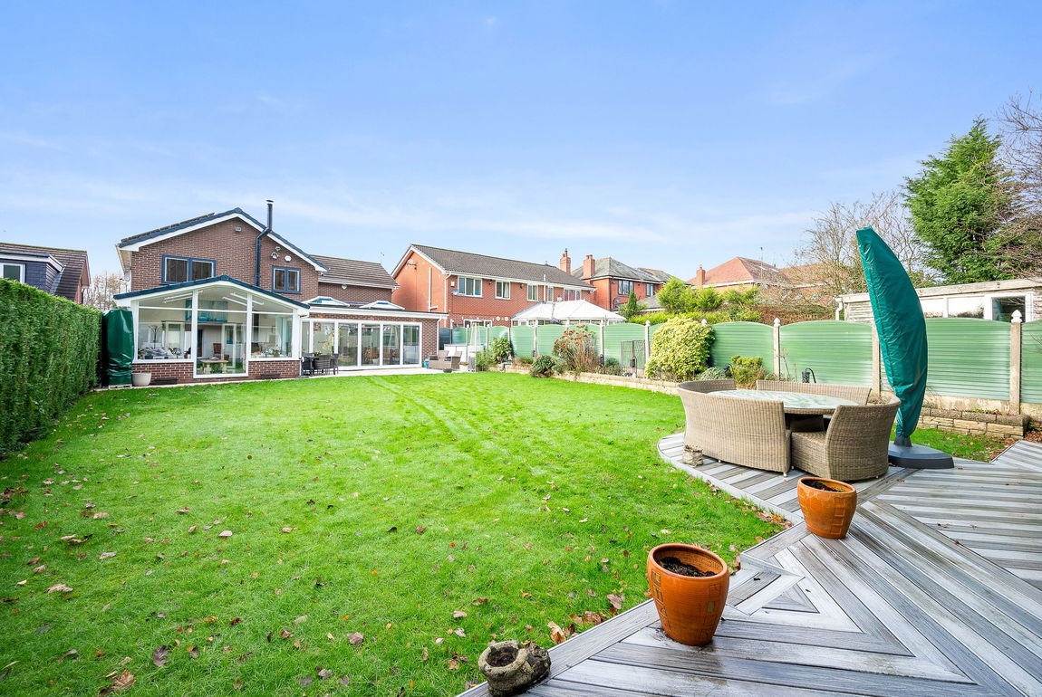 Outside, the rear garden has clearly been a much-loved part of the home for many years. Generous in size and well screened, it offers a real sense of privacy and space — somewhere children can play freely, family gatherings can spill outside, and summer days can be enjoyed without feeling overlooked. The lawn is complemented by a patio area that naturally lends itself to outdoor dining and relaxed evenings, while the outlook towards mature trees beyond adds to the feeling of peace and privacy. To the rear of the garden, a further raised decked patio catches the sun on warmer days, offering a lovely spot to sit back and relax with your favourite tipple in hand. There is also a substantial garden room, providing valuable additional space that works just as well for storage as it does for more flexible future use. There is also gated access through to the front driveway, providing a discreet sense of privacy and security that complements the home’s setting and the large driveway provides a welcoming and settled feel from the moment you arrive.