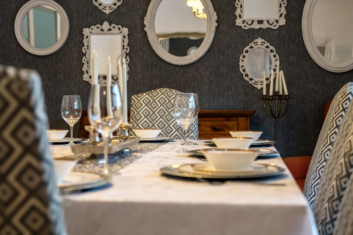 Flowing from the kitchen and family room is an elegant lounge, centred around a striking contemporary fireplace and enhanced by two skylights that flood the space with natural light. French doors open directly onto the rear garden, creating a wonderful connection between indoor and outdoor living. Double doors from the kitchen also lead into the formal dining room, a beautifully appointed space featuring charming window seating built into the bay window— perfect for family dinners, celebrations and entertaining guests.
