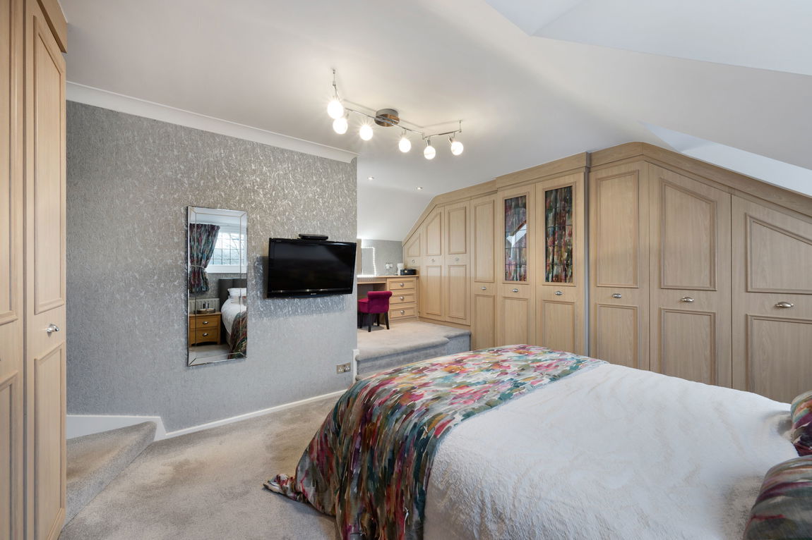 Upstairs, the sense of space and fluent flow continues. The generous landing connects five beautifully proportioned bedrooms, all carefully styled in soothing, neutral tones, creating a cohesive and calming first-floor retreat, offering flexibility for growing families, guests or home working. The principal suite is an elegant and beautifully proportioned space, designed with privacy, comfort and understated luxury in mind. Complete with a dressing area and private ensuite, creating a calm sanctuary at the end of the day. A luxurious family bathroom with a corner bath invites indulgent evenings, while a separate contemporary shower room ensures mornings remain stress-free.