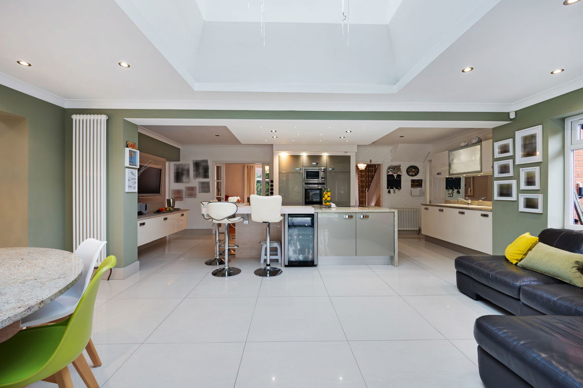 The kitchen is beautifully designed with contemporary cabinetry, stylish granite worktops and a feature central island that draws people together. This light-filled space is perfectly suited to both everyday family life and entertaining, flowing effortlessly into the family seating and dining areas and opening out to the garden beyond.