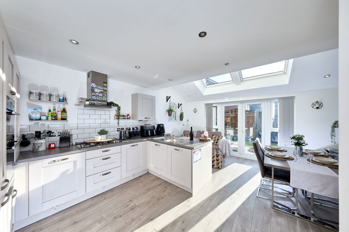 At the heart of the home is the stunning open-plan kitchen, dining and family hub, flooded with natural light from vaulted ceiling and striking skylights. The contemporary kitchen is fitted with a range of sleek cabinetry in cashmere, integrated appliances and a breakfast bar area, seamlessly connecting the cooking, dining and relaxed seating areas. Large French doors open directly onto the rear garden, creating a wonderful flow between indoor and outdoor living, perfect for entertaining and everyday family life. The ground floor WC is neatly positioned off the kitchen, adding practicality without disrupting the flow of the living space.