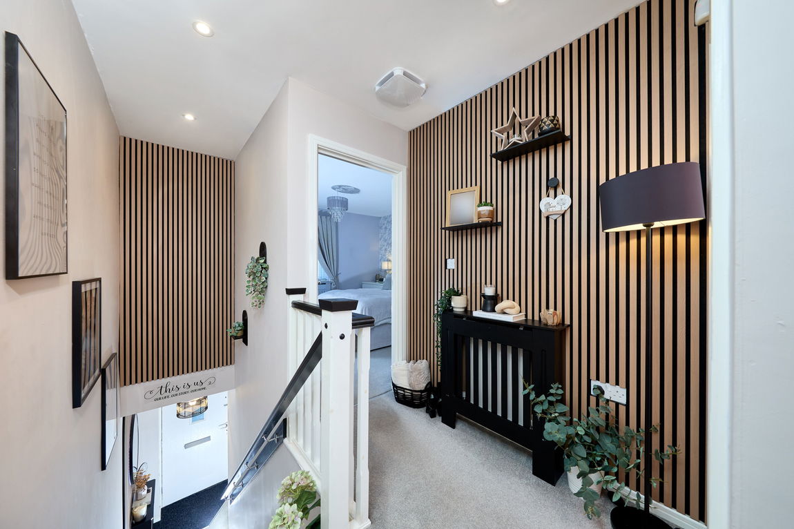 The staircase rises to a beautifully styled landing, finished with contemporary wall panelling that adds character and creates a cohesive, on trend interior design-led feel to the first floor.