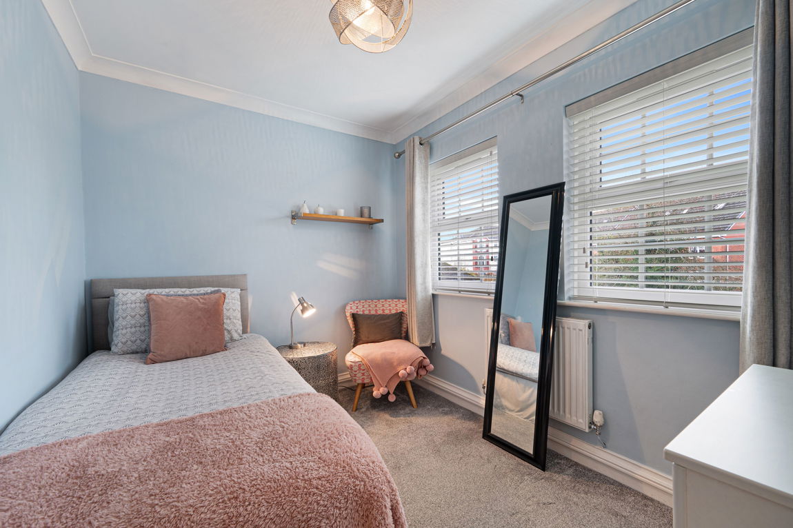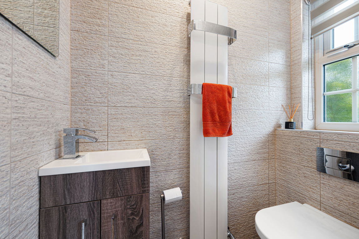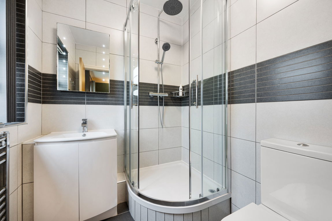 The principal and second bedrooms both benefit from stylish en-suite shower rooms, while the remaining bedrooms are served by a beautifully finished fully tiled family shower room — contemporary, crisp and thoughtfully detailed.