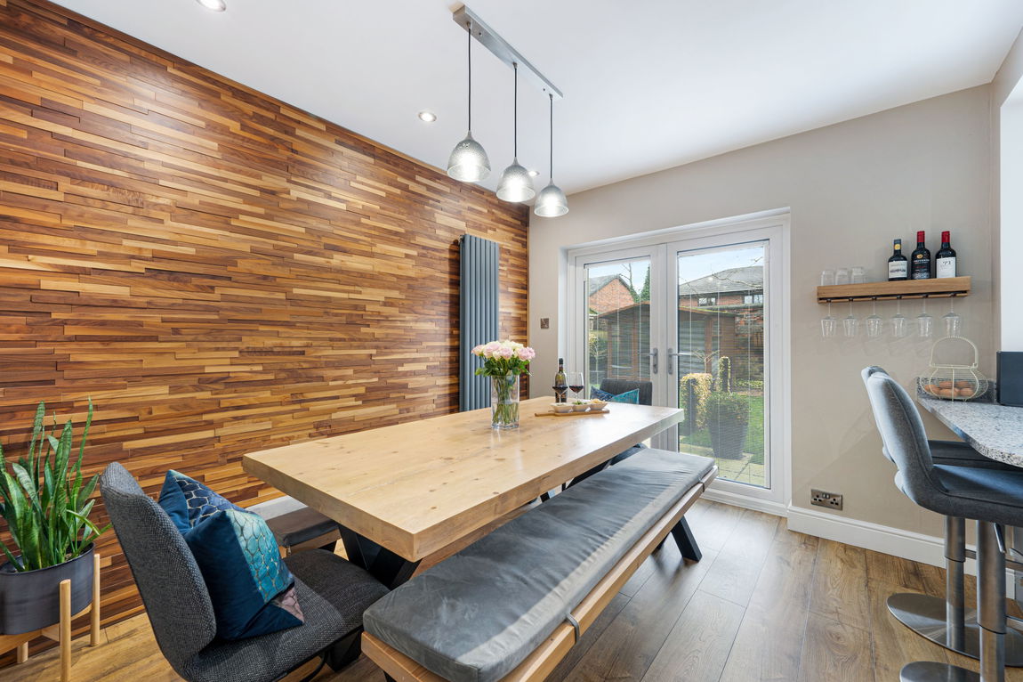 To the rear, the house opens into what is truly the social heart of the home. The kitchen-dining space has been designed for the way modern families genuinely live — effortlessly balancing everyday moments with effortless entertaining. Sleek shaker-style cabinetry, granite worktops and a host of integrated appliances create a space that is both functional and refined. French doors draw the outside in, opening onto the landscaped garden and extending the entertaining space effortlessly in the warmer months. It’s easy to imagine summer gatherings here, doors open, music playing, conversation flowing.