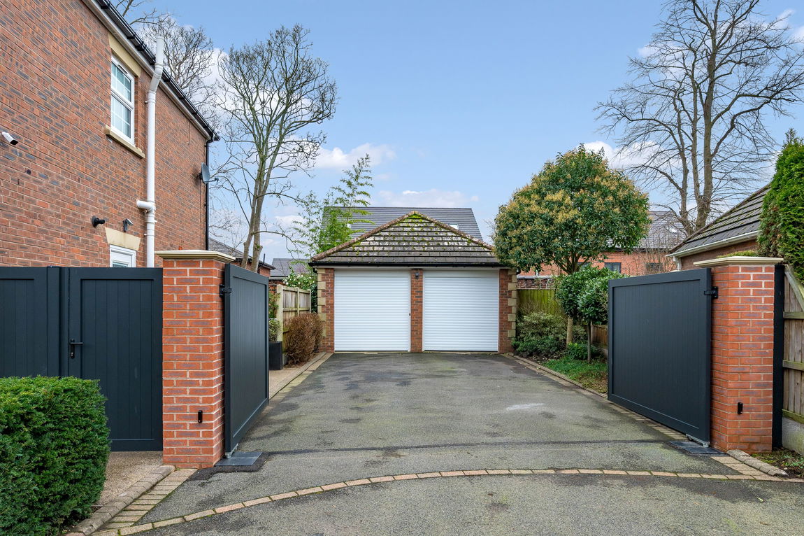 A hedge-lined frontage and pathway create an attractive approach and excellent first impression. While electric gates open onto a substantial private driveway, creating both presence and privacy, and leading through to the detached double garage — secure, practical and impressively proportioned.