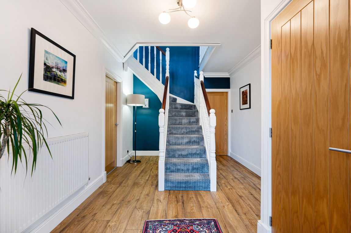 Step through the front door and you’re met with a galleried staircase rising from a generous entrance hall — an introduction that feels both impressive and inviting. There’s an immediate sense of calm here. Space to pause. Space to breathe. The proportions are exactly what you’d hope for in a true family home.