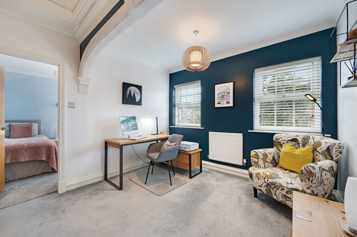 Upstairs, the sense of space continues. The galleried landing is more than a walkway; it’s an architectural feature, leading through an elegant archway to an additional study area overlooking the front aspect — a versatile space that could, subject to the relevant consents, become a fifth bedroom if required and reinforces the home’s quiet grandeur.