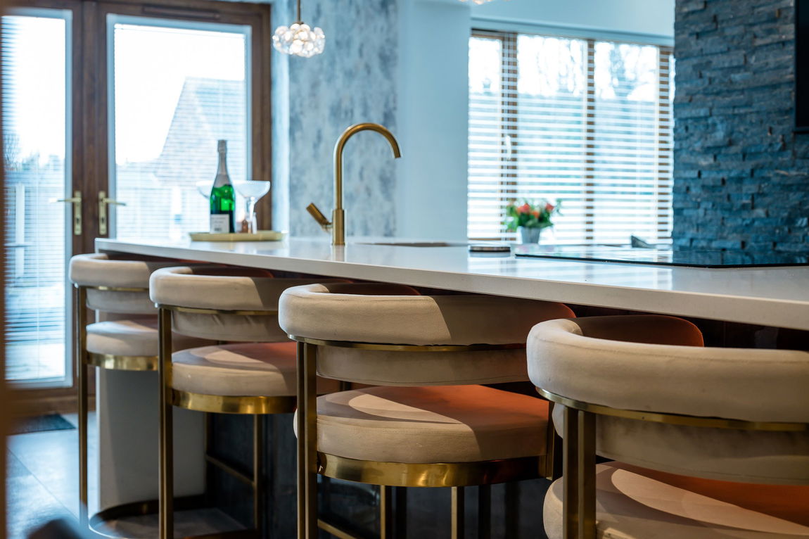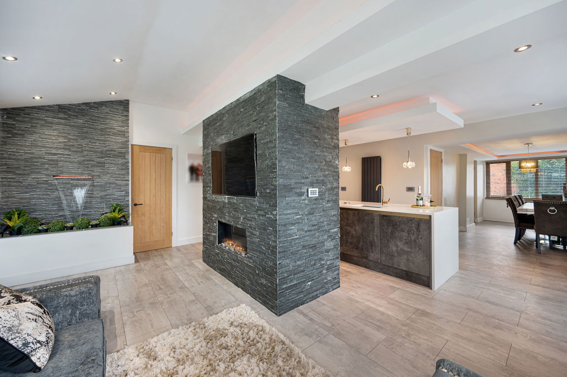 A striking stone feature wall anchors the room, complete with inset fireplace and integrated media wall, adding warmth and architectural flair. The sleek island takes centre stage, offering generous preparation space, seating and a natural place for everyone to gather.